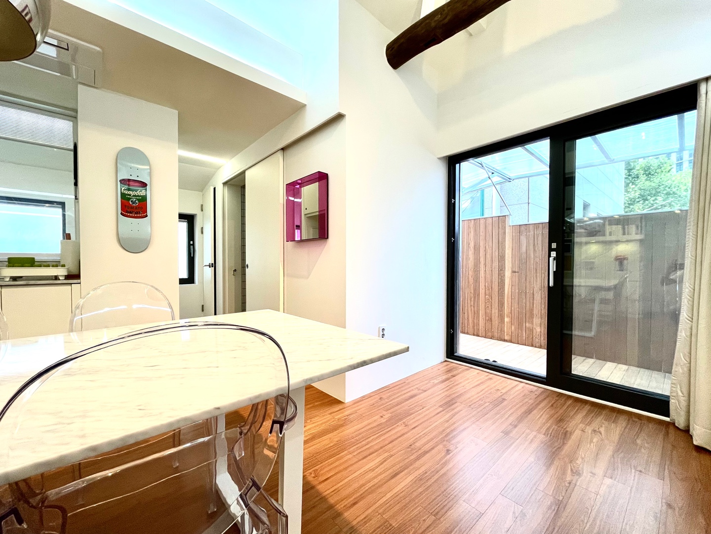 눅서울의 두 번째 프로젝트를 위해 후암동 뒷골목 오래된 2층 적산가옥을 마주했을 때 옛것의 가치를 존중하며 여럿이서 함께 즐길 수 있는 쾌적한 공간을 만들고자 했습니다. 4.5m 높은 천고를 가로지르는 목구조와 그 아래 놓인 2.5M X 1M 크기의 최대 8인용 대리석 테이블은 N2의 공간 콘셉트를 잘 보여줍니다. 다이닝룸 한편에 자리한 소파 라운지와 야외 테라스는 N2에 머무는 게스트의 다양한 개성과 취향을 배려하는 공간입니다.